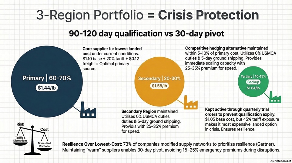 Critical: All three must be simultaneously qualified and running. “We can switch if needed” means nothing if qualification takes 120 days and tariffs change overnight.